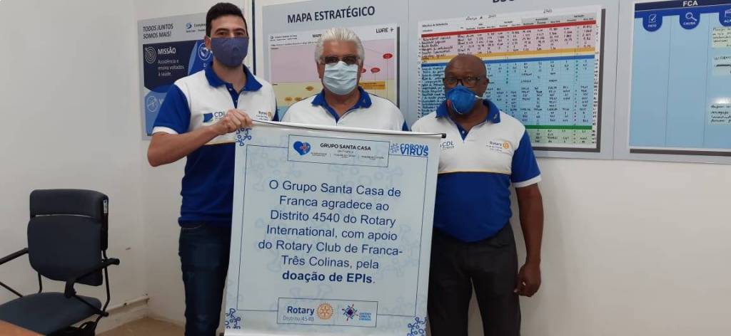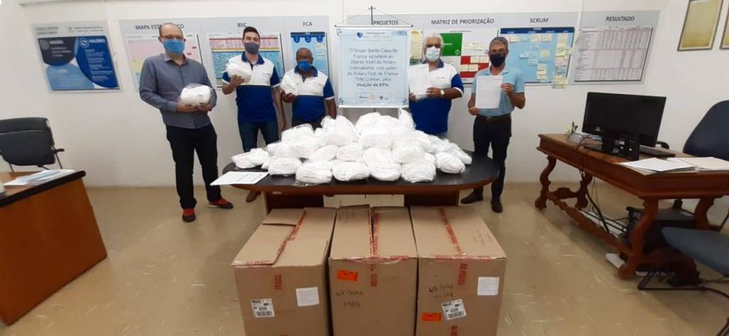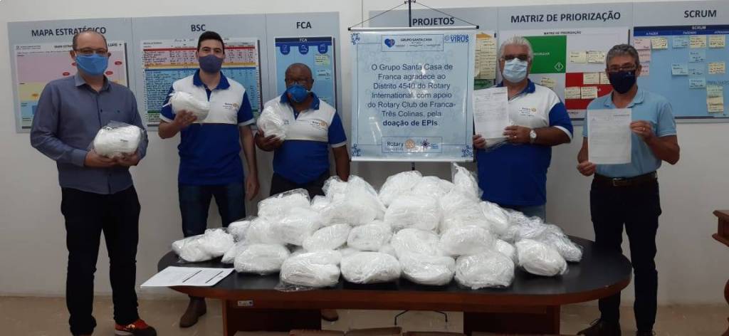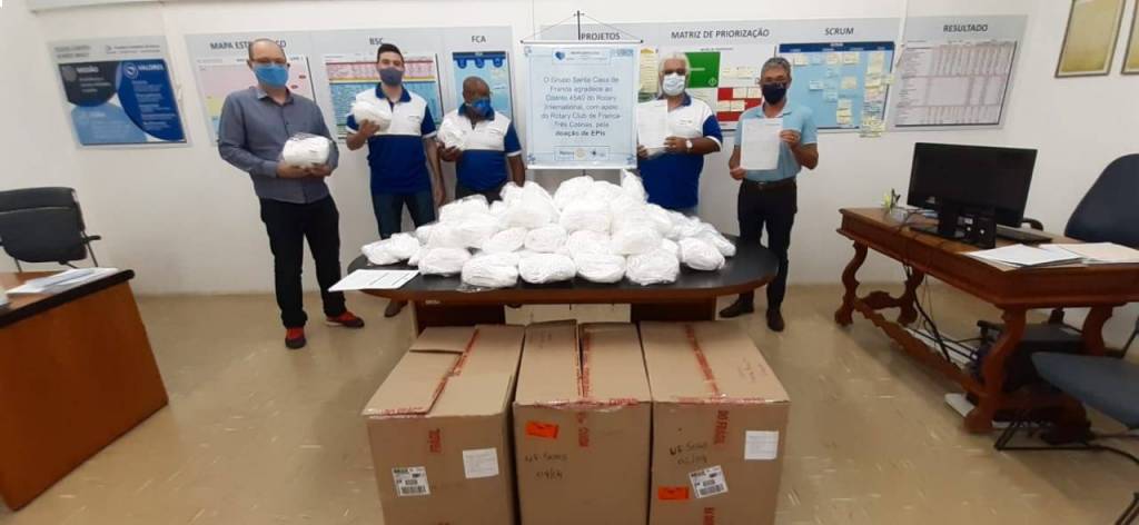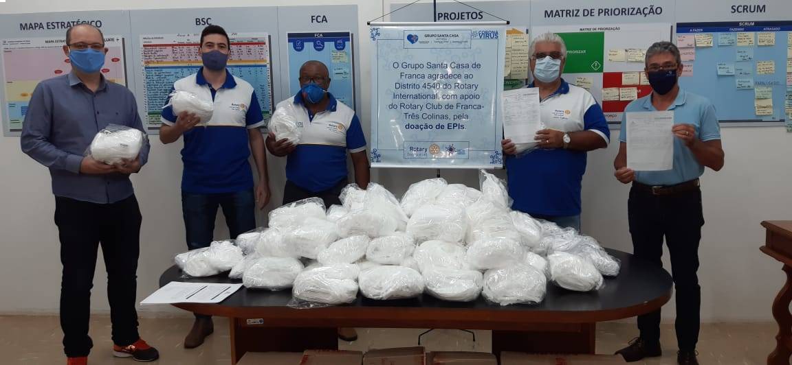 Na manhã desta segunda-feira, 11 de maio, o Grupo Santa Casa de Franca recebeu a doação no valor de R$ 31.875,00 realizada pelo casal Governador do Rotary Distrito 4540, Aparecido Gilberto de Carvalho e Cláudia Regina Pereira – e também pelo Rotary Club de Franca-Três Colinas, representado na ocasião por Carlos Eugênio Bittar, Daniel Bassi e José Reis Marcelino. A doação foi revertida na compra de 9.660 máscaras cirúrgicas descartáveis, fornecidas pela empresa Zentys Produtos Hospitalares Ltda.